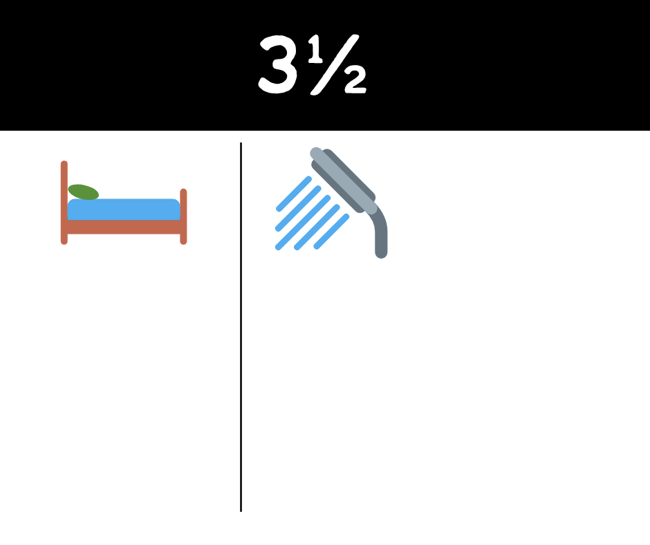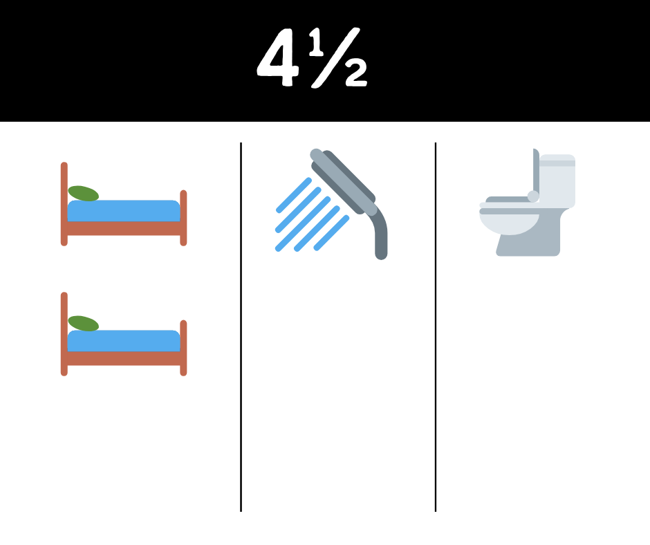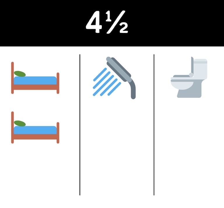 Le 4½ comprend 2 chambres fermées, un grand salon, une cuisine fonctionnelle et 1,5 salle de bain (une salle de bain complète et une salle d’eau). Idéal pour une petite famille ou des colocataires. Inclut 1 stationnement.