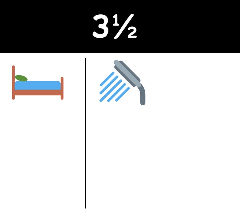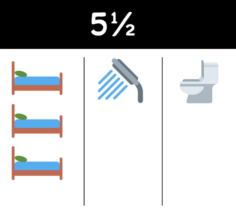 Notre plus grand logement, le 5½, offre 3 chambres fermées, un espace de vie lumineux, une cuisine complète et 1,5 salle de bain (une salle de bain complète et une salle d’eau). Parfait pour les familles ou ceux qui recherchent plus d’espace. Inclut 2 stationnements (soit un à l'intérieur et un à l'extérieur).